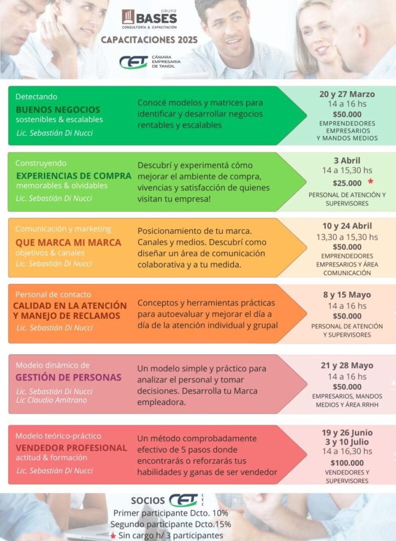 Compartimos la agenda del Grupo Bases de Capacitaciones 2025 organizada por Grupo Bases Consultoría & Capacitación en conjunto con la Cámara Empresaria de Tandil (CET). Se ofrece una serie de cursos destinados a empresarios, emprendedores, mandos medios, supervisores y personal de atención, abordando temáticas claves del mundo laboral y comercial actual.