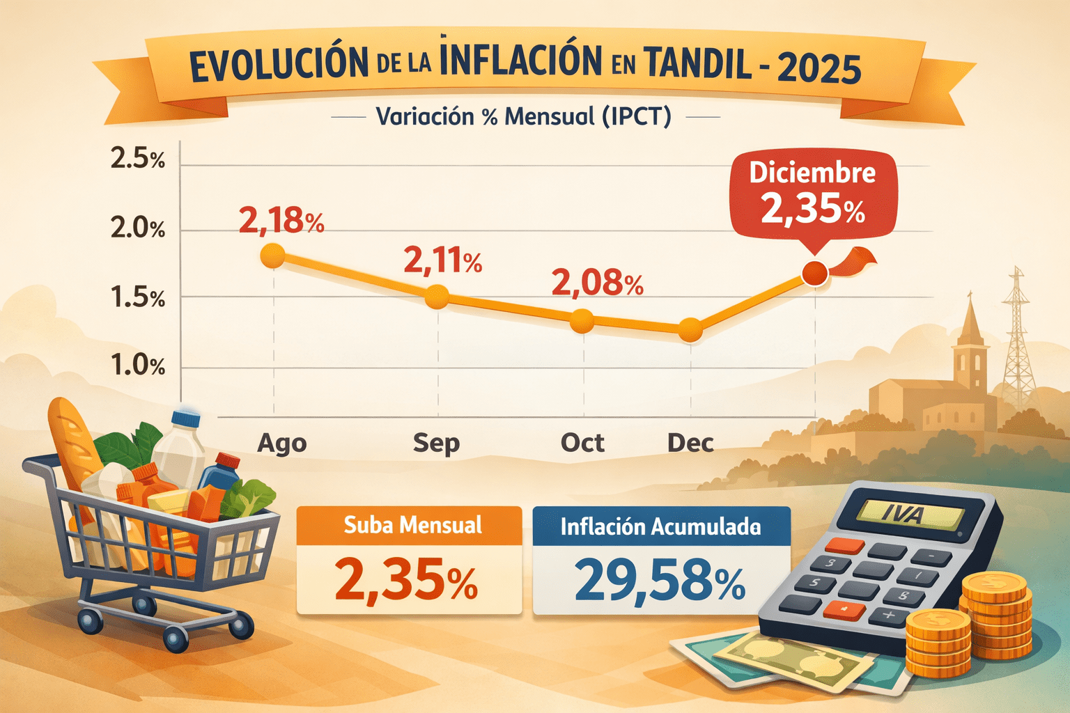 La inflación en Tandil de diciembre 2025 concluyó con una suba del 2,35%, según el Índice de Precios Online de Tandil (IPCT), que releva mensualmente miles de precios de bienes y servicios en la ciudad. Este dato se produce en medio de un escenario económico nacional donde los precios continúan con ritmo positivo a pesar de los esfuerzos por desacelerarlos.